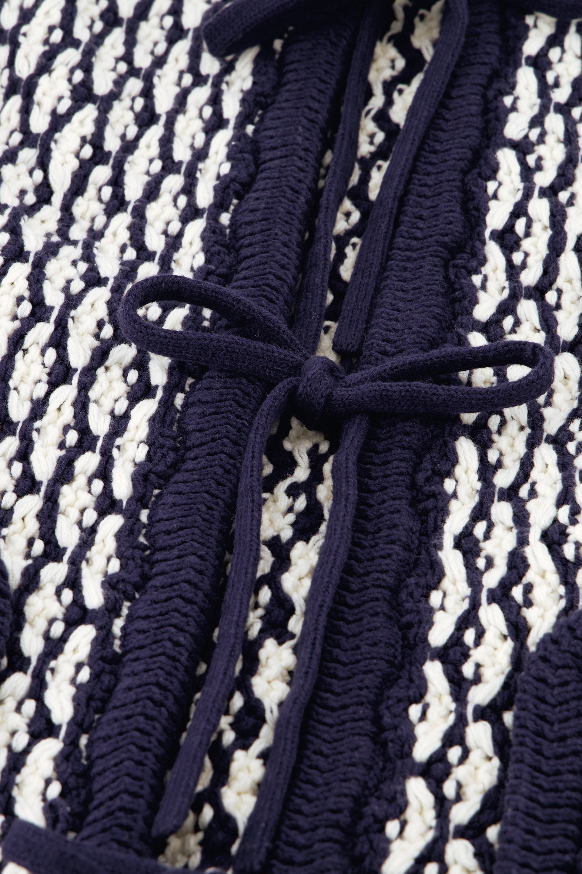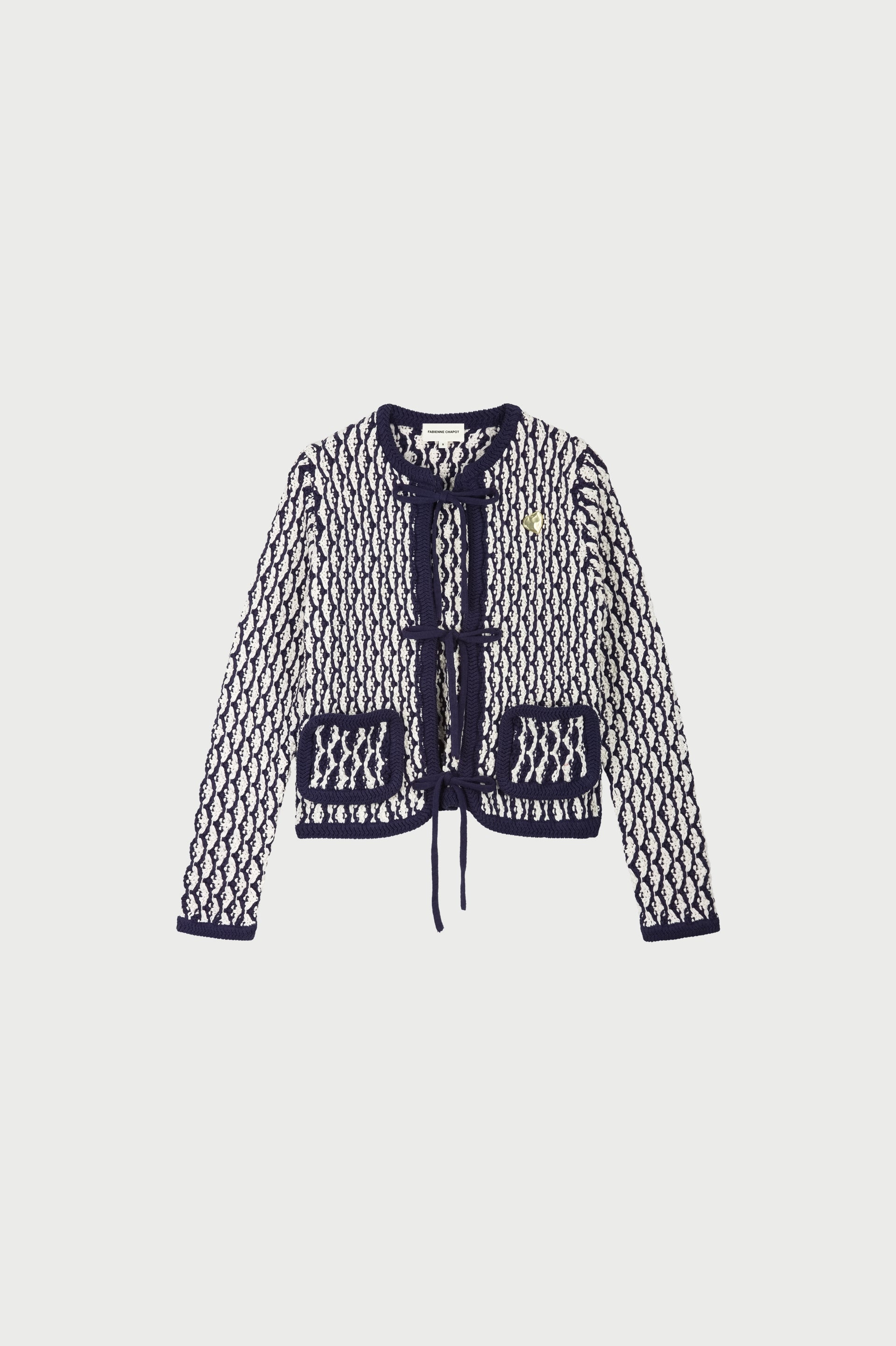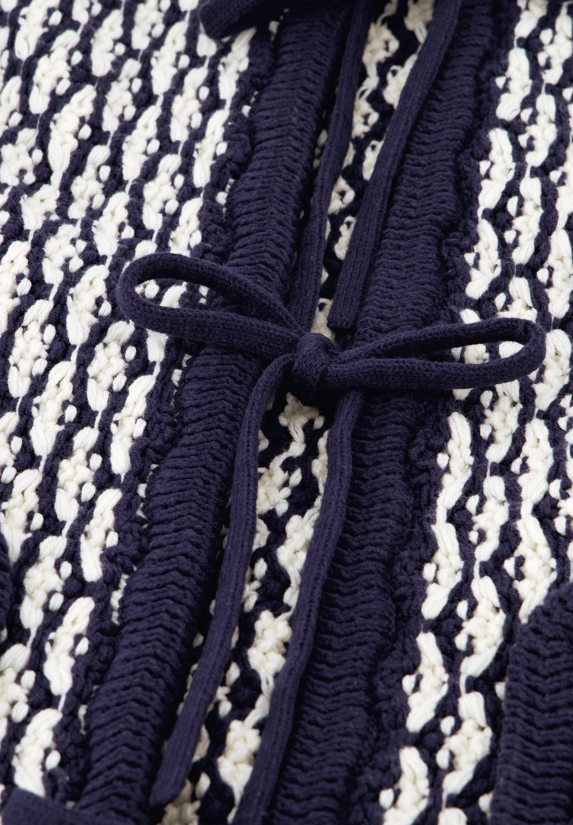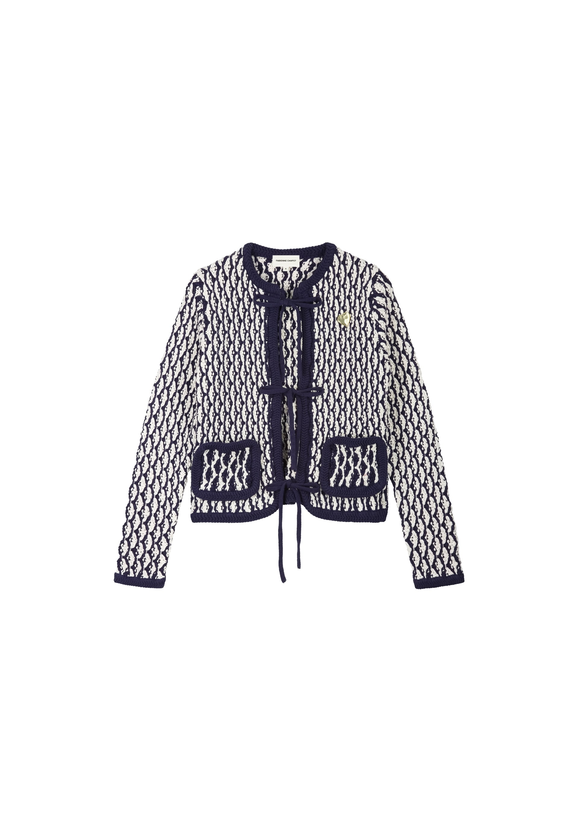 This cream white and navy cardigan, crafted from a soft organic cotton and acrylic blend, features a classy, elegant print for a timeless look. Cozy and comfortable, it’s the perfect layering piece to add refined style and effortless sophistication to any outfit.