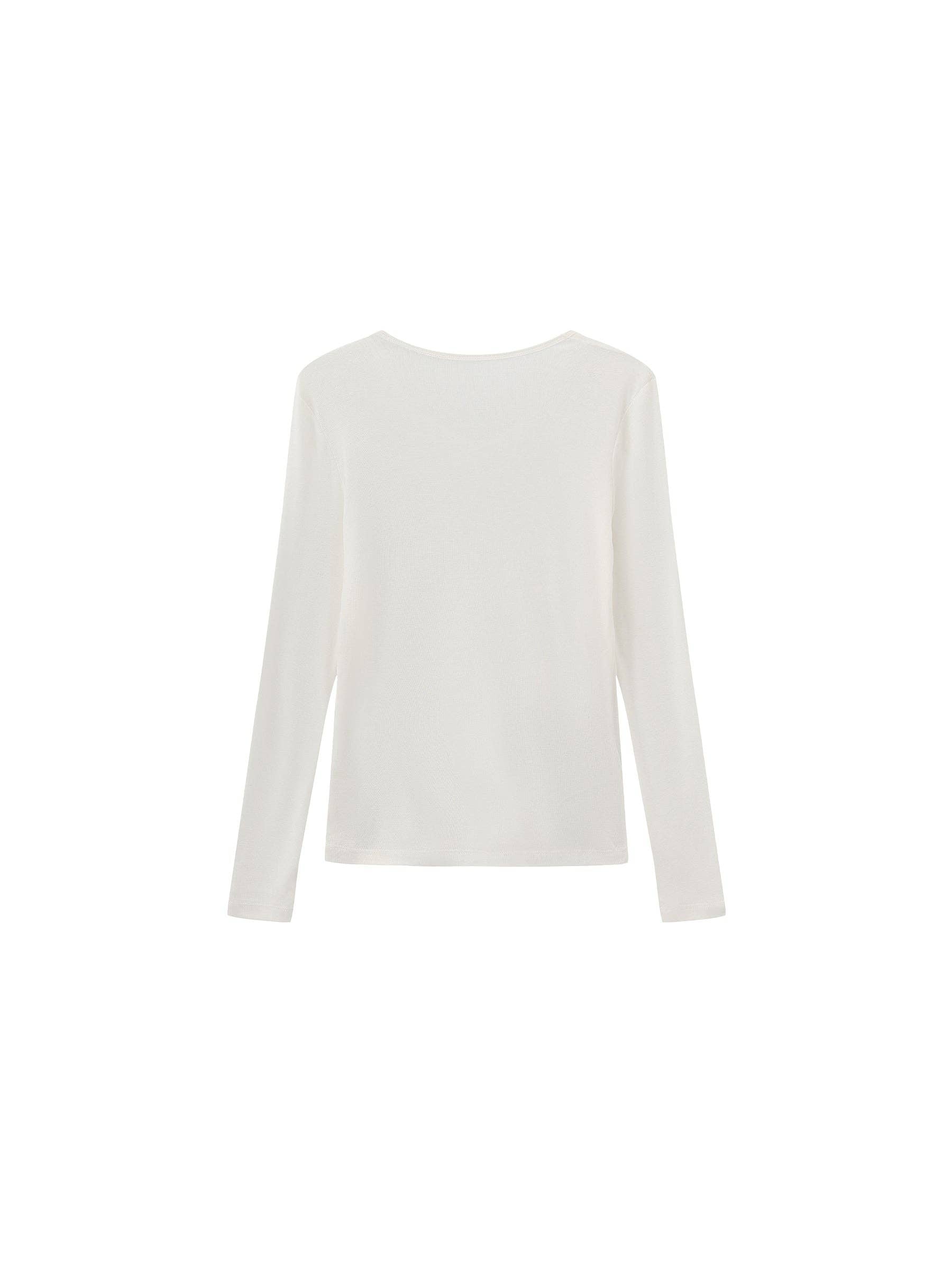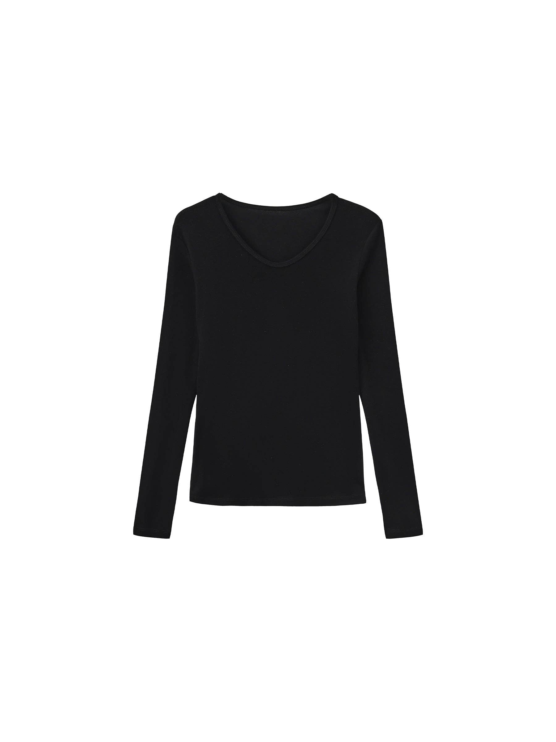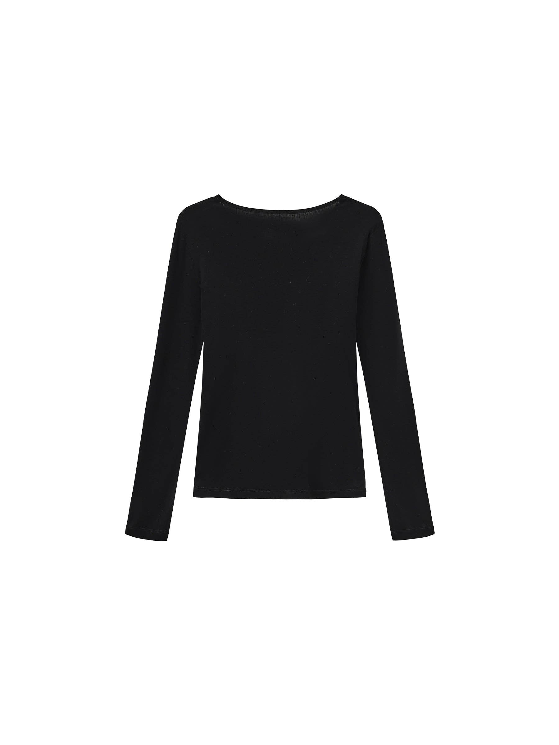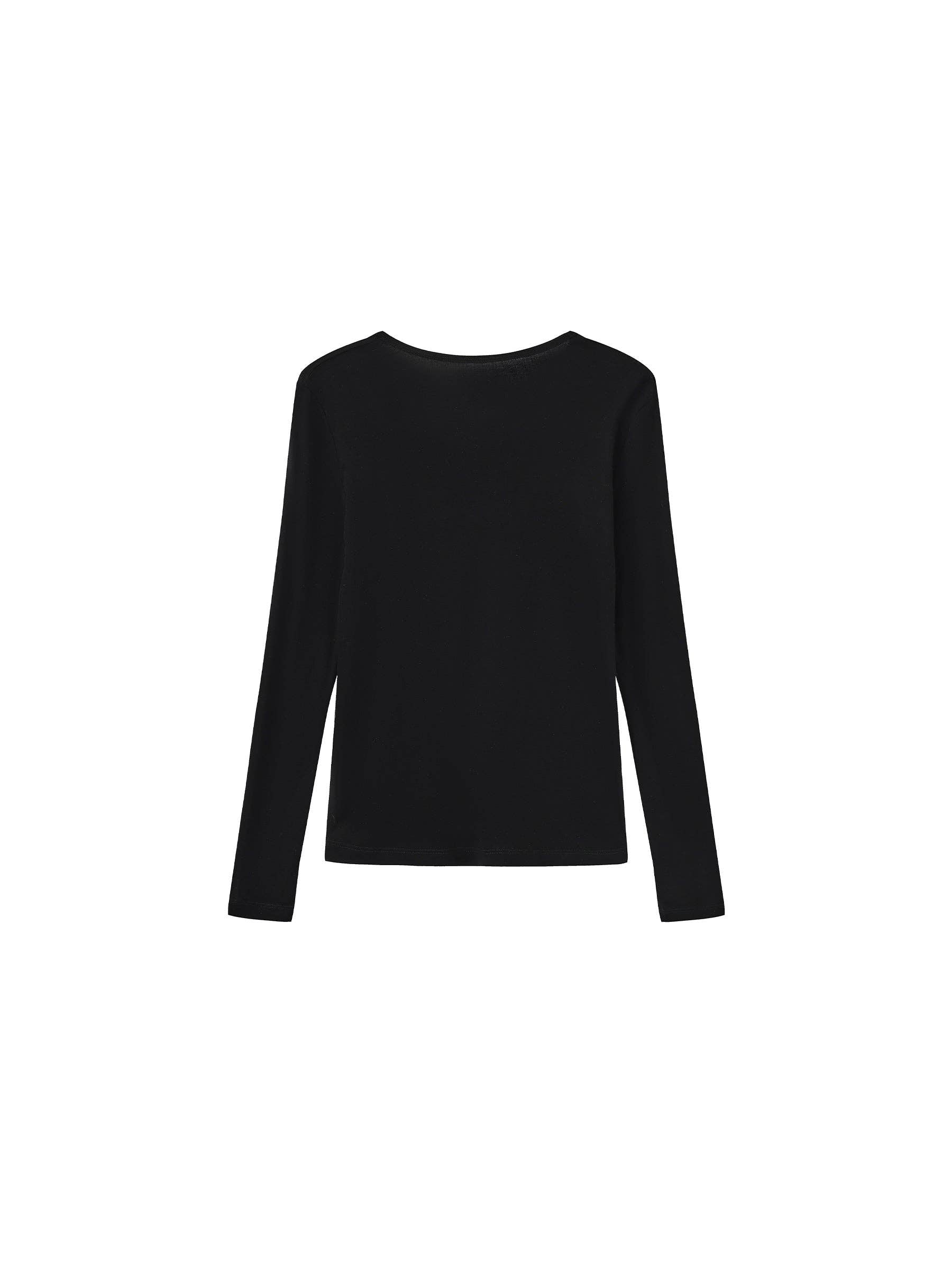Basic long-sleeve layering top in black/white/gray. Designed with a straight-cut silhouette and clean shoulder line. Available in three neckline options. Minimalist and versatile, ideal for effortless layering. The fabric composition is 84.7% Lyocell, 12.7% Sheep Wool, 2.6% Spandex. Model wears size M, which is suitable for UK size 10.