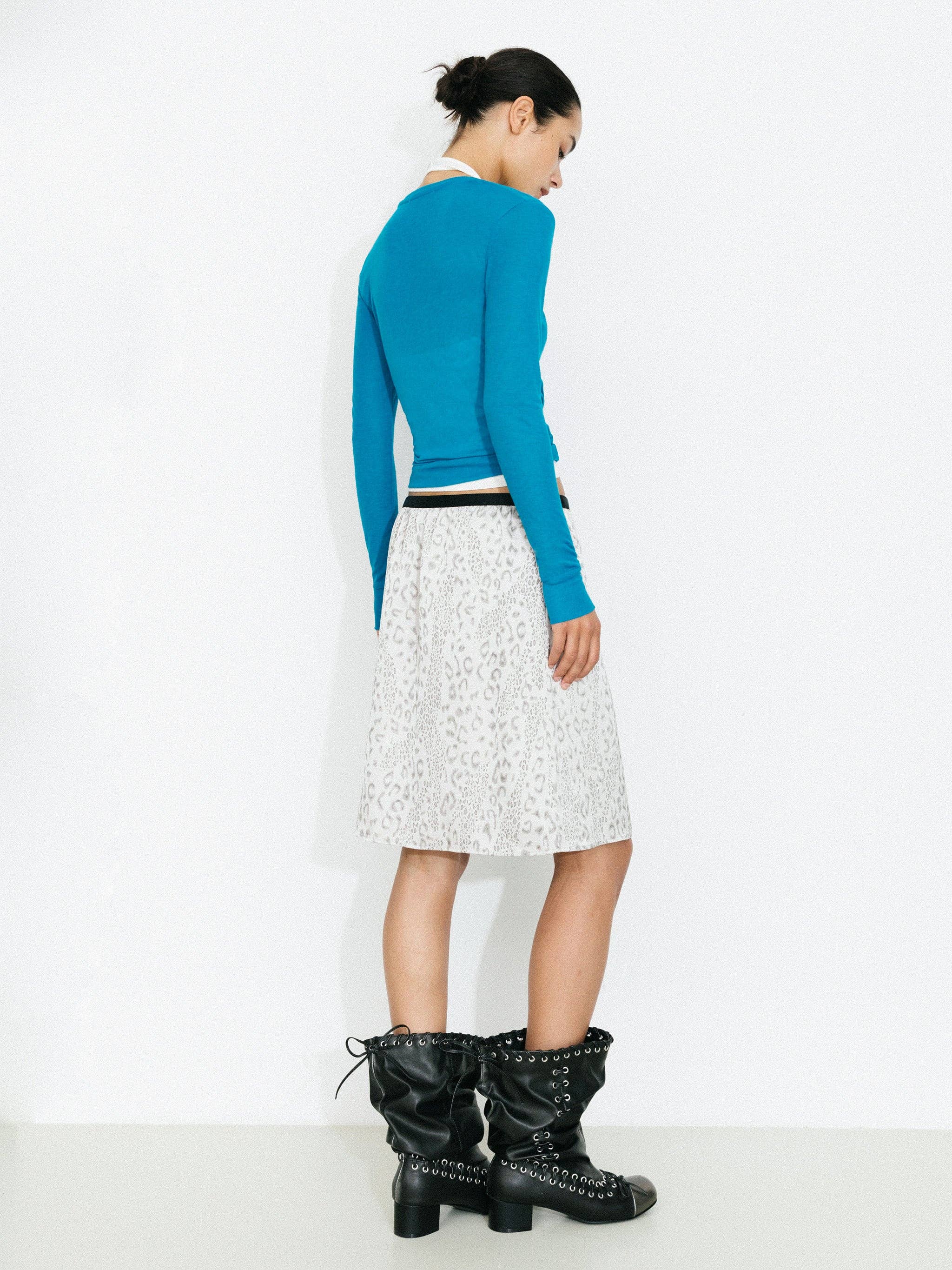 Henley neck slim-fit long-sleeve top in blue from C by CUBIC collection. This slim-fit long-sleeve T-shirt features a classic Henley neckline with subtle button detailing. Crafted from a semi-sheer fabric, it offers a lightweight feel and a refined, feminine silhouette perfect for layering. The fabric composition is 80% Lyocell 20% Recycled Fiber. Model wears size UN, which is suitable for UK size 8-12.