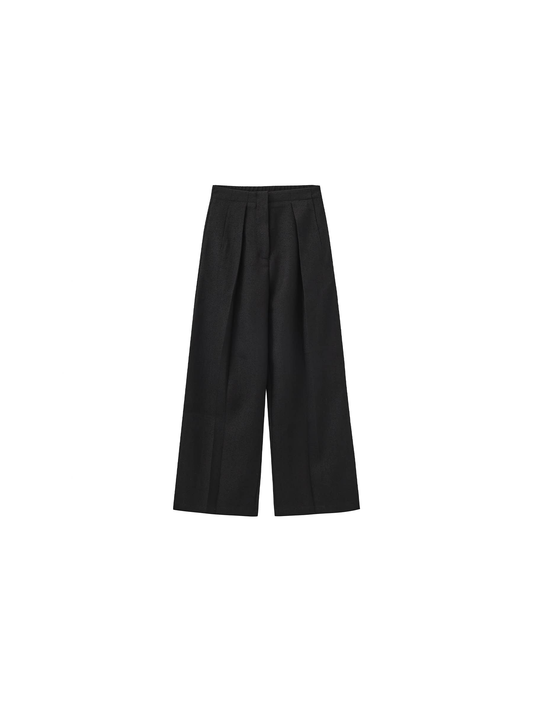 Draped pleated wide-leg pants in black. Featuring an elasticated waist and straight-leg cut for a relaxed, fluid silhouette. Minimalist design with clean lines and effortless drape. The fabric composition is 80% polyester 18% viscose 2% spandex. Model wears size M, which is suitable for UK size 10. Product Code: COBEP6005