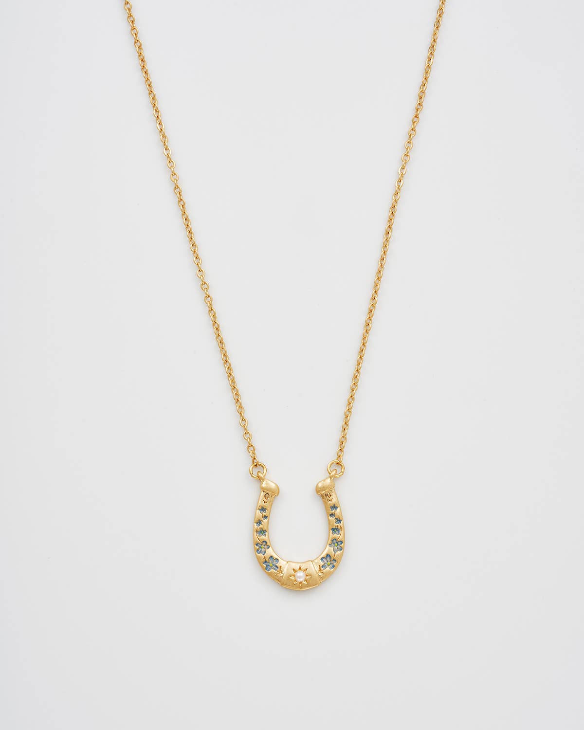 The Horseshoe Necklace is a symbol of love and luck, hand painted with delicate blue florals and adorned with a single faux pearl for a touch of timeless grace. The horseshoe pendant, suspended from a fine gold plated chain, embodies charm and optimism a beautiful reminder that good fortune is always close to heart