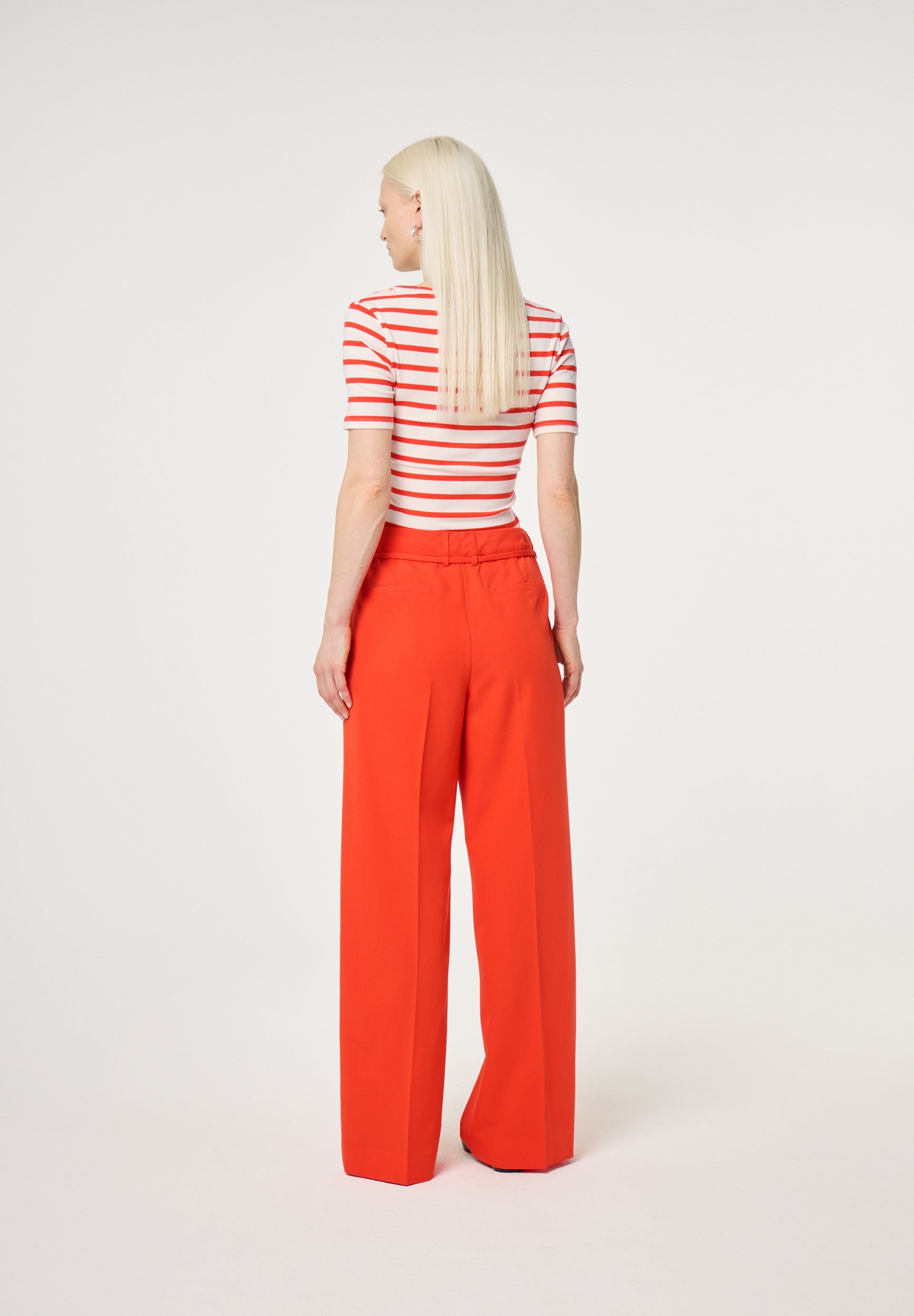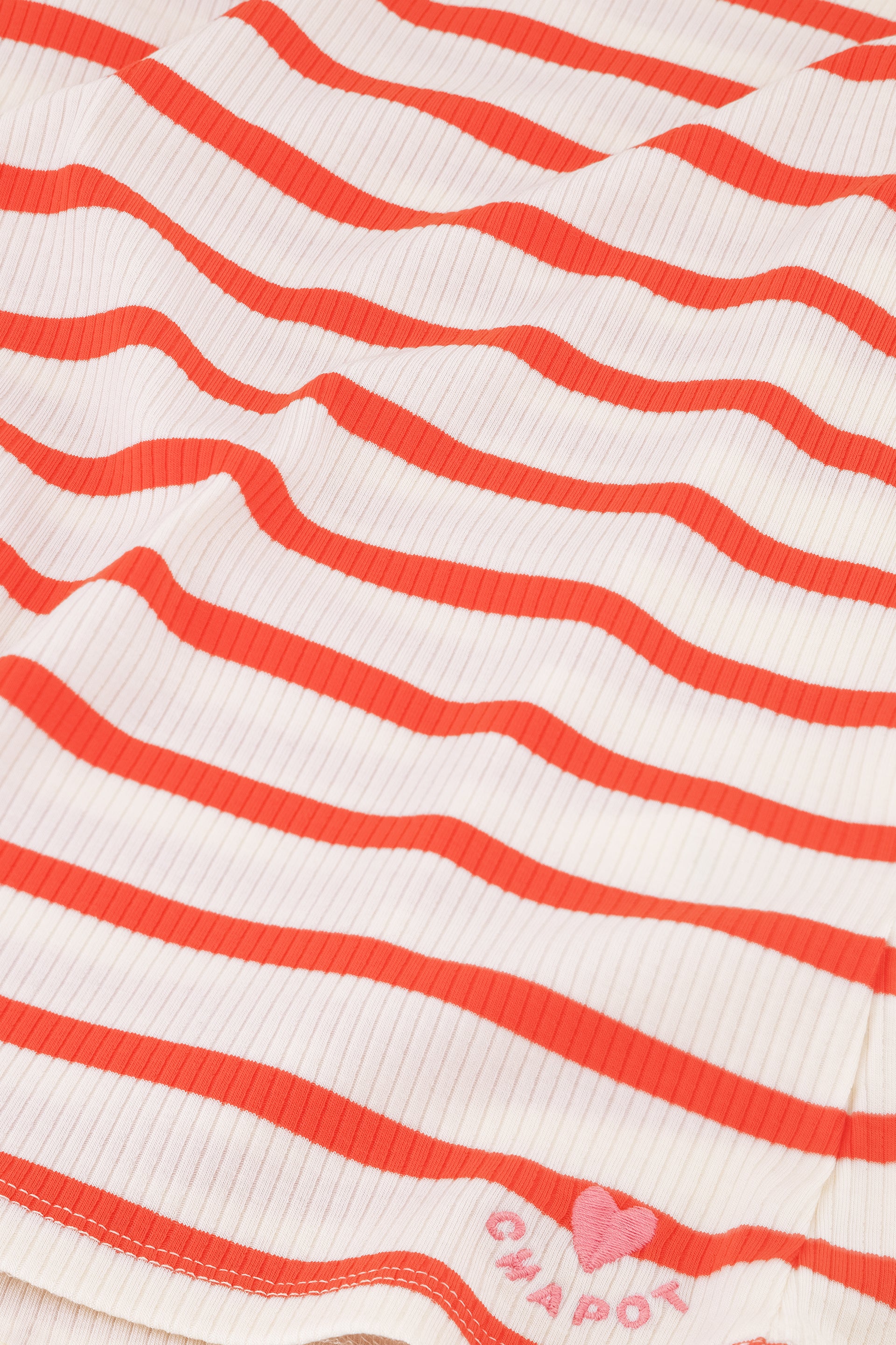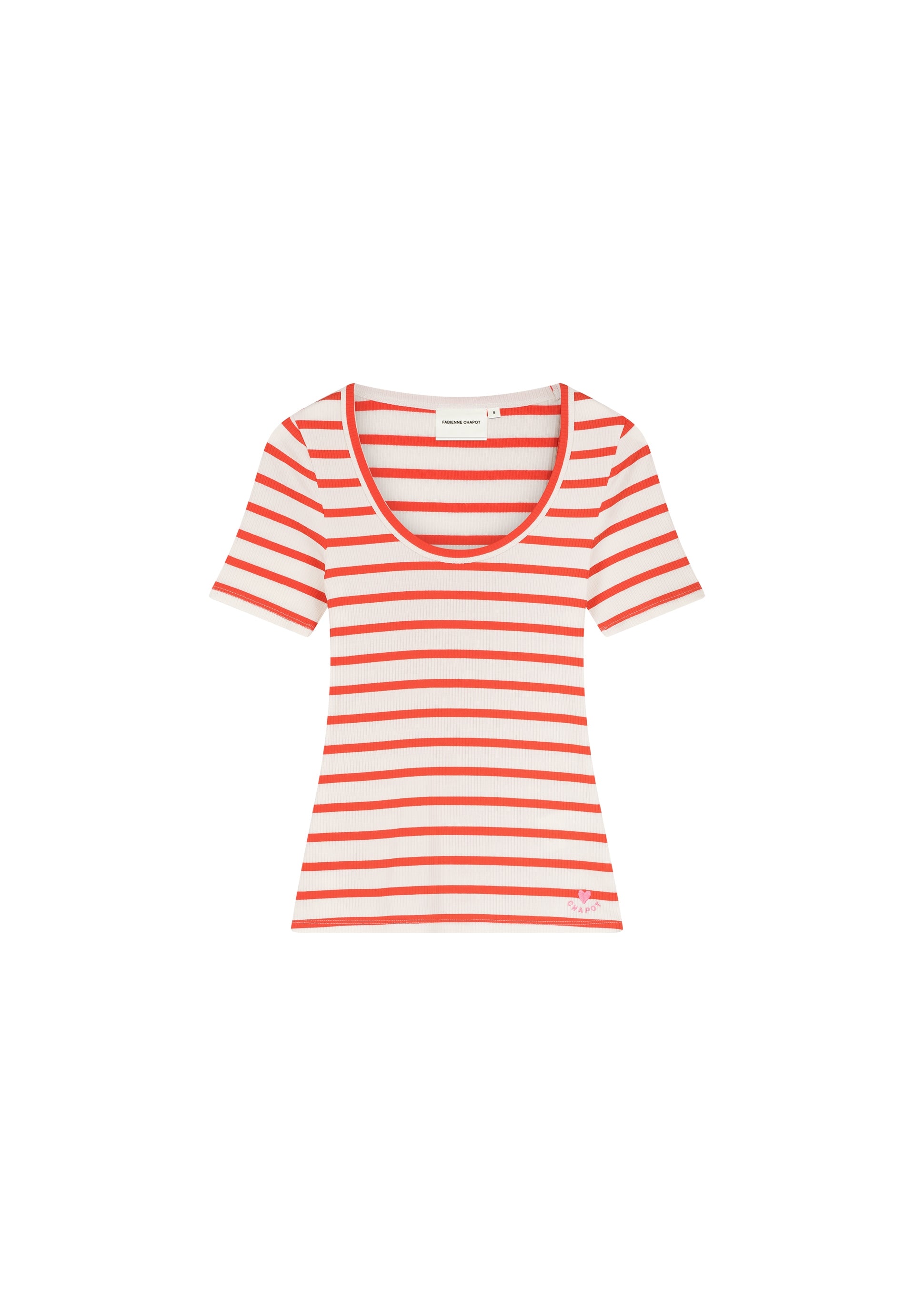 A slim-fit short sleeve T-shirt in clean white with bright tangerine horizontal stripes. Finished with a classic round neckline, it’s an easy everyday piece that feels fresh and flattering. Perfect for casual days, weekend errands, or layered under a jacket.