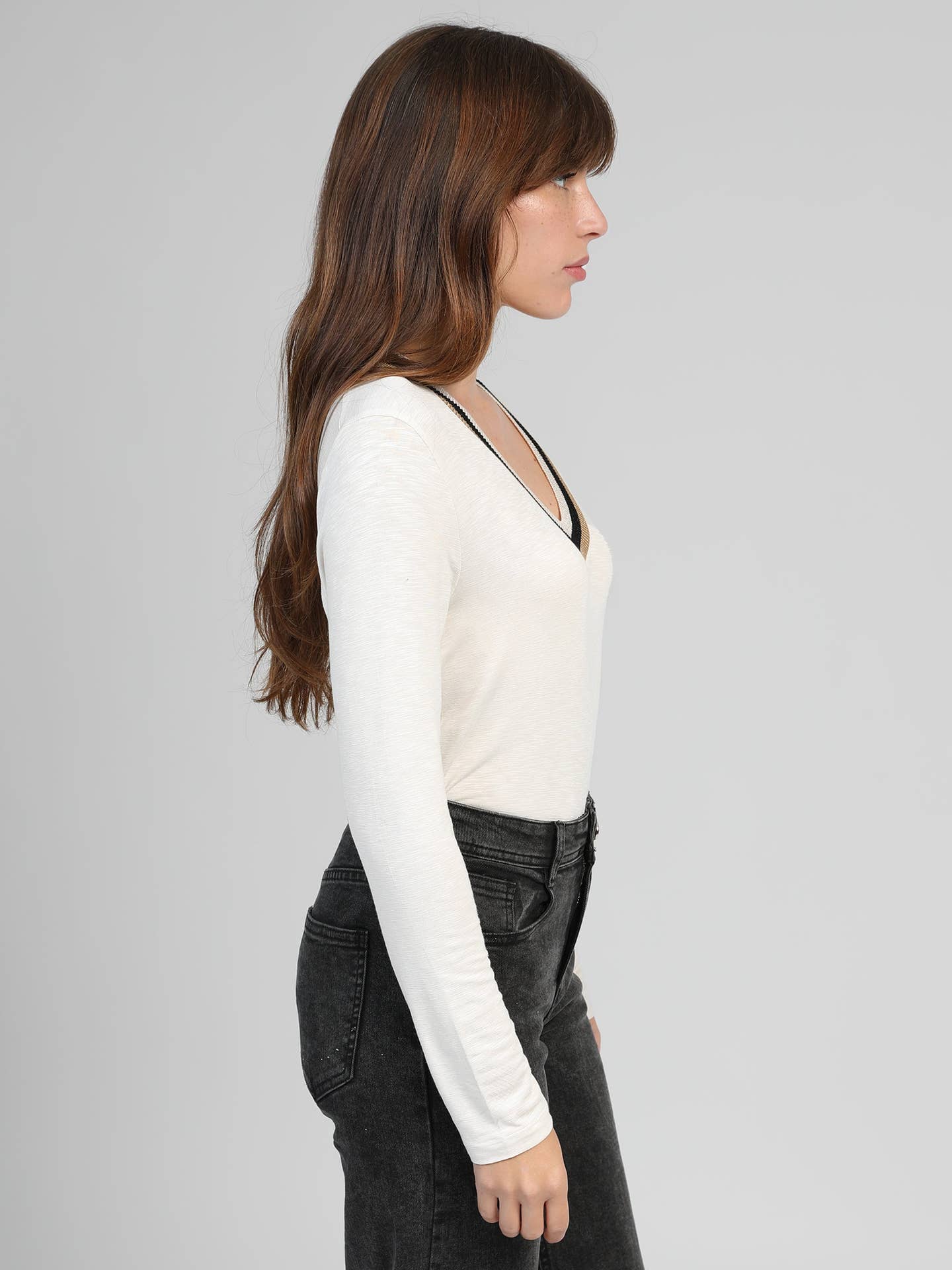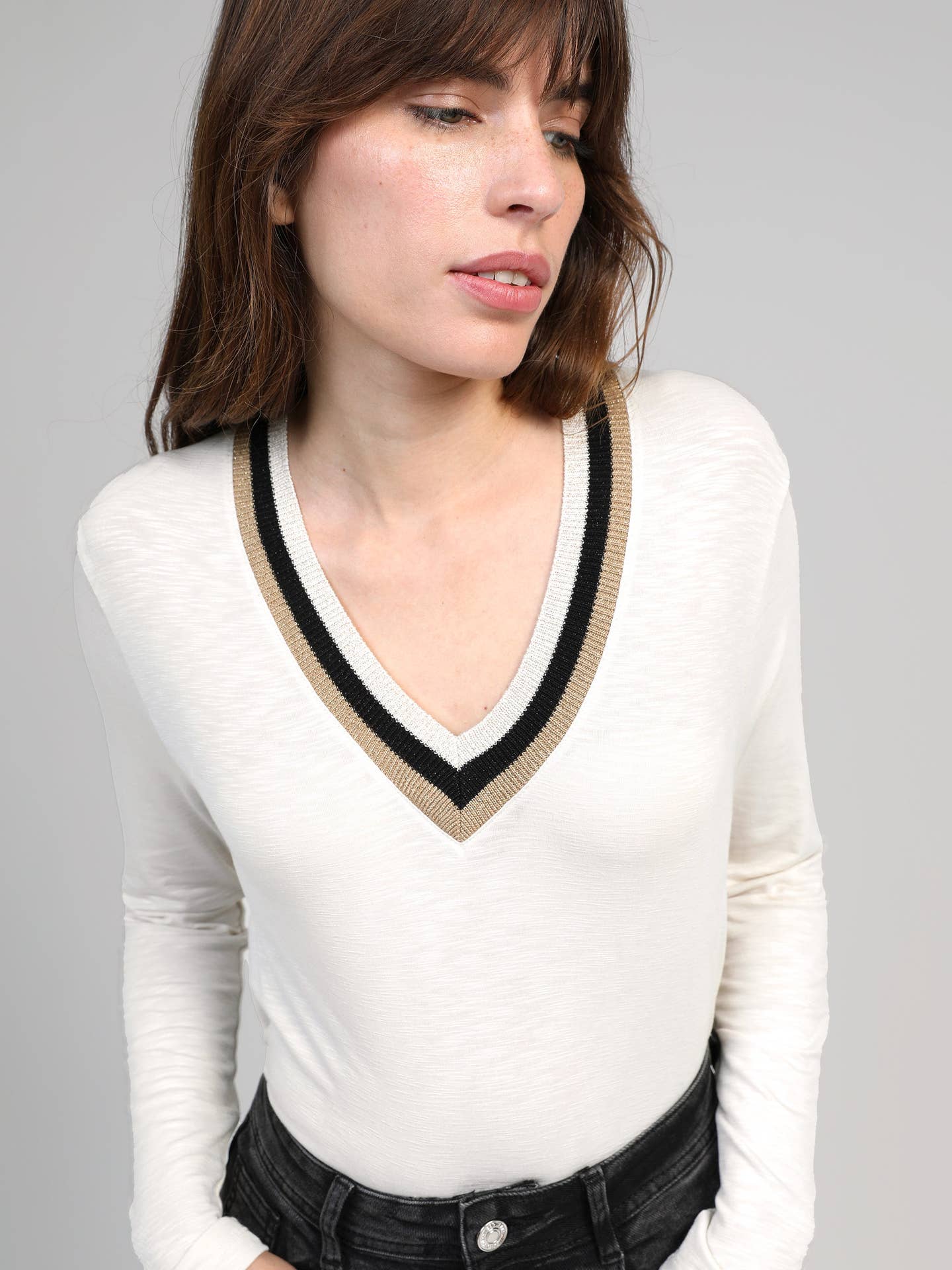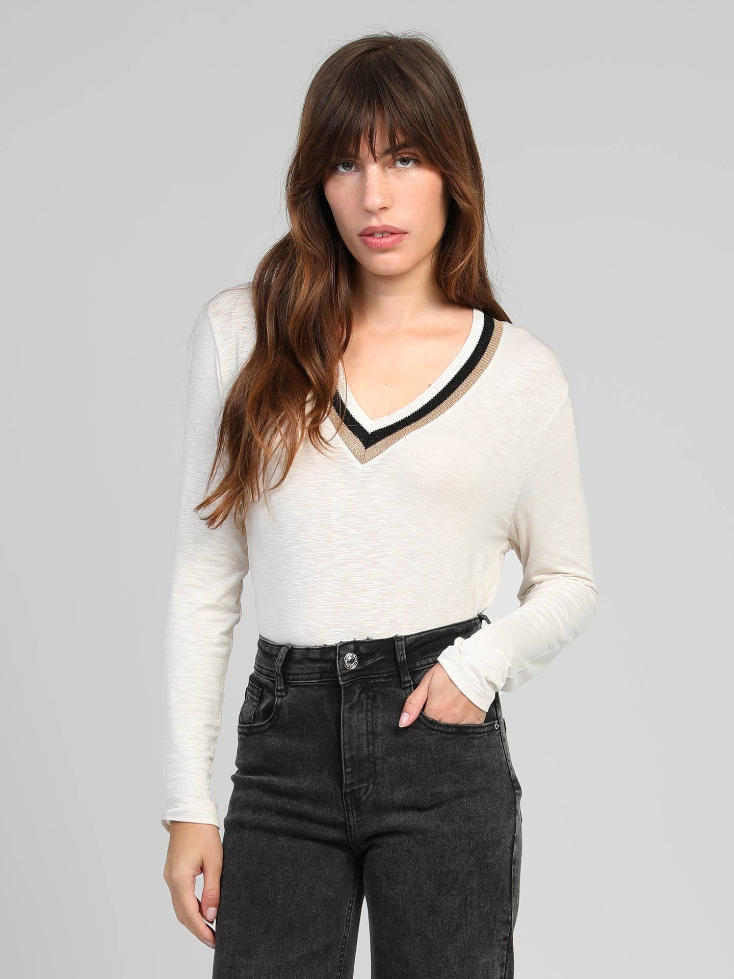 A must-have in your wardrobe, the TONGALI t-shirt features ribbed edges. A basic to pair with pants or a skirt. Soft touch V-neck Long sleeves.